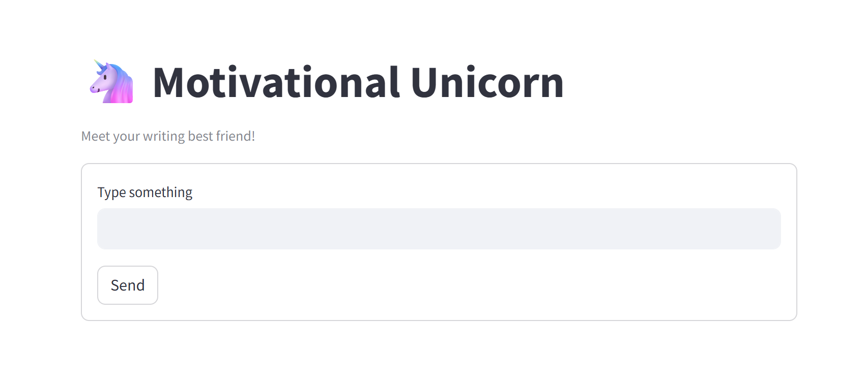 Motivational Unicorn is a generative AI chatbot designed to help writers tackle their next big project! Motivational Unicorn will help you think positively about the day ahead and give you writing prompts, advice, and motivational quotes.